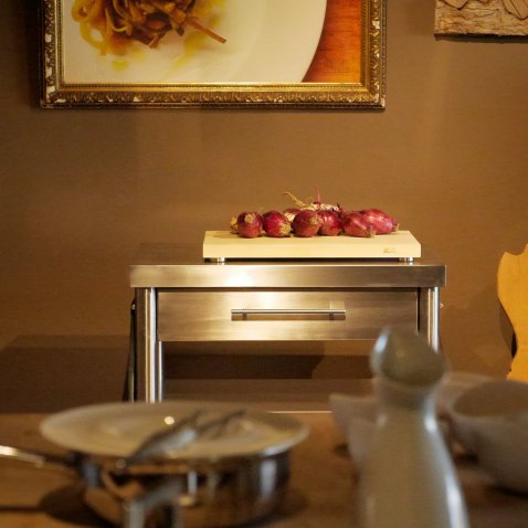 A fully-equipped JOKODOMUS cart that can follow you around the kitchen, making sure you always have it when you need it. A workstation that is perfect for complementary items like slicers or stand mixers. Thanks to its innate elegance and functionality, the cart can serve as the base for all slicing and cutting work in a kitchen. It can also become a kitchen center from which you can serve an aperitif, or the means for bringing a warm dish to a table filled with guests.