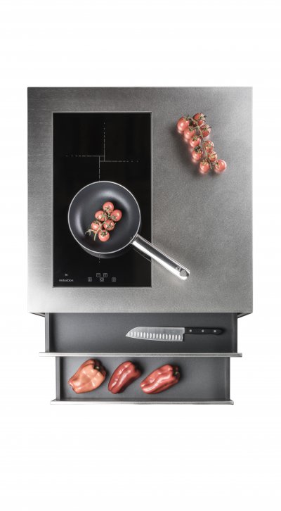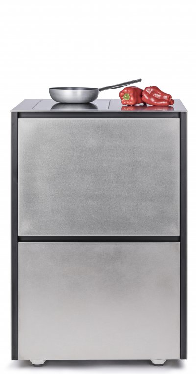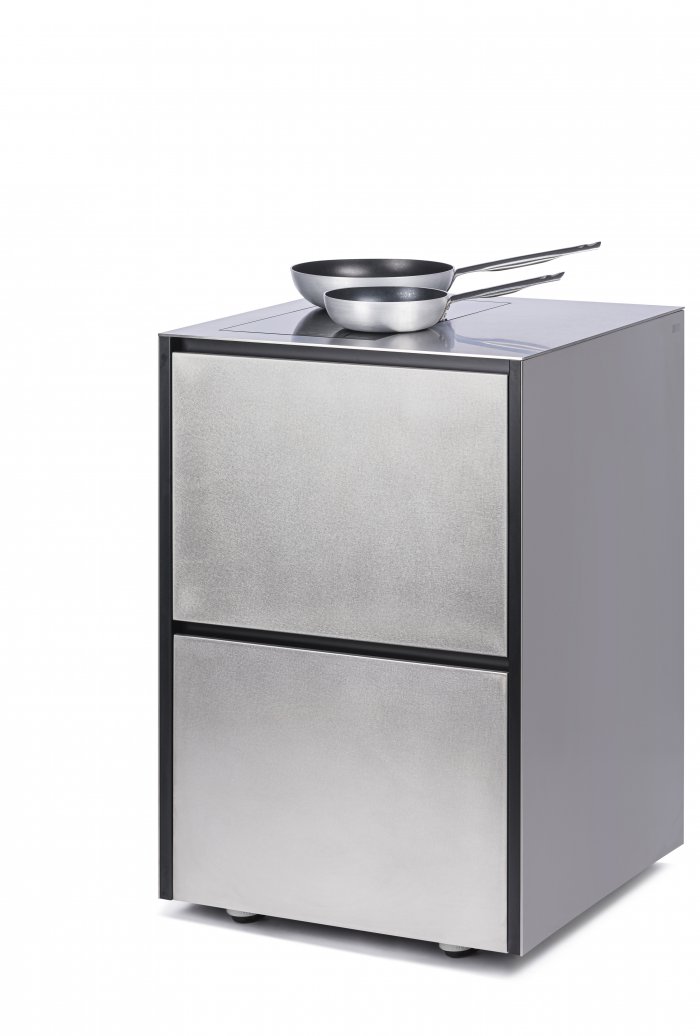 ONO Induktion 2 Zonen - Edelstahl 316. Der Küchenwagen aus mattem Edelstahl der Serie ONO mit Induktionsplatte 2 Zonen und zwei Schubladen. Die Schubladen sind grifflos und können zur Reinigung einfach ausgeklinkt werden. Die Arbeitsplatte aus 4 mm Voll-Edelstahl ist robust und widerstandsfähig. Schwarzes Innenleben. Das Modul steht auf versteckten Rollen (mit Feststellfuß und Höhenjustierung). Das Anschlußkabel befindet sich unter dem Boden des Wagens. Induktionskochfeld 2 Zonen • Gesamtleistung 3,7 kW • 1 Zone 200mm Durchmesser 2,3-3 kW • 1 Zone 160mm 1,4 kW