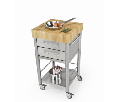 Kochstation aus Edelstahl der Serie CUN light mit zwei Ablagen ohne Schublade. Die Arbeitsplatte aus Edelstahl ist robust und widerstandsfähig. Der Küchenwagen hat links und rechts je ein Stecksystem zur Bestückung von Zubehör oder zum Einhängen einer Verbindungsbrücke.