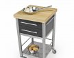 Küchenwagen aus Acrylstein schwarz der Serie Auxilium mit zwei Schubladen und einer Ablage. Die Arbeitsplatte aus Weißbuche Längsholz ist robust und widerstandsfähig. Die Schubladen sind aus Edelstahl und können zur Reinigung ausgeklinkt werden. Der Küchenwagen hat links und rechts je eine Reeling zur Bestückung von Zubehör oder zum Beispiel Küchentücher.