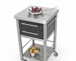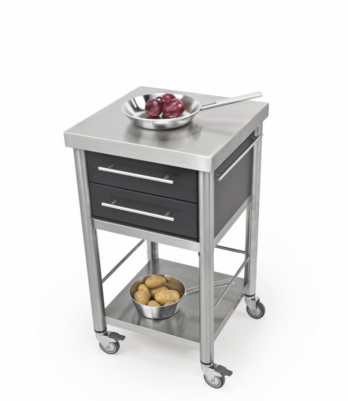 Küchenwagen aus Acrylstein schwarz der Serie Auxilium mit zwei Schubladen und einer Ablage. Die Arbeitsplatte aus Edelstahl ist robust und widerstandsfähig. Die Schubladen sind aus Edelstahl und können zur Reinigung ausgeklinkt werden. Der Küchenwagen hat links und rechts je eine Reeling zur Bestückung von Zubehör oder zum Beispiel Küchentücher. Dieser Wagen ist für den Innen- sowie den Außenbereich geeignet.