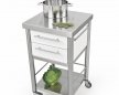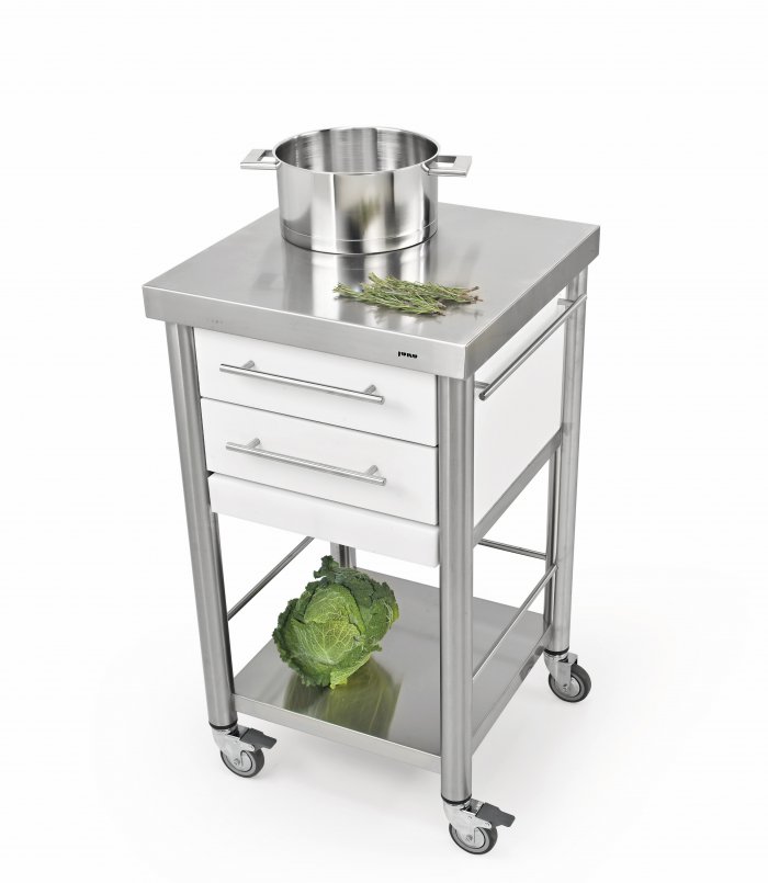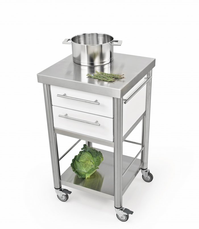 Küchenwagen aus Acrylstein weiß der Serie Auxilium mit zwei Schubladen, einem Auszugsschneidbrett und einer Ablage. Die Arbeitsplatte aus Edelstahl ist robust und widerstandsfähig. Die Schubladen sind aus Edelstahl und können zur Reinigung ausgeklinkt werden. Das Auszugschneidbrett aus weißem Polyäthylen (oder wahlweise aus Weißbuche) ist unter der zweiten Schublade positioniert. Dieses Schneidbrett kann auf die Arbeitsplatte gelegt werden und wird durch eine Anschlagleiste festgehalten. Der Küchenwagen hat links und rechts je eine Reeling zur Bestückung von Zubehör oder zum Beispiel Küchentücher. Dieser Wagen ist für den Innen- sowie den Außenbereich geeignet.
