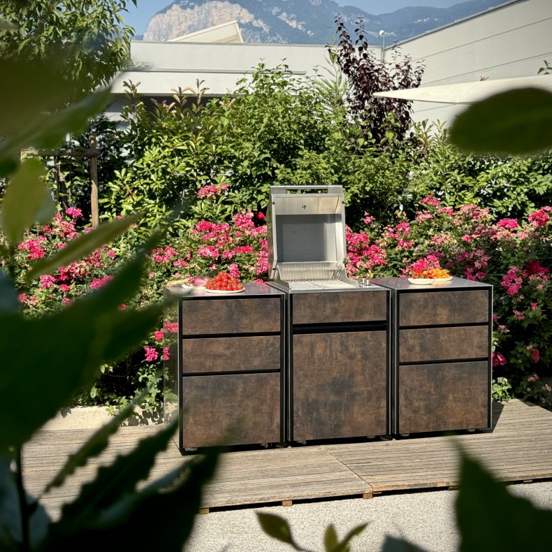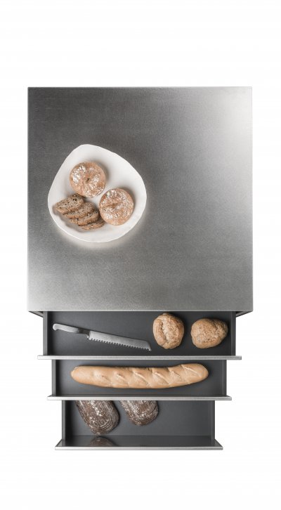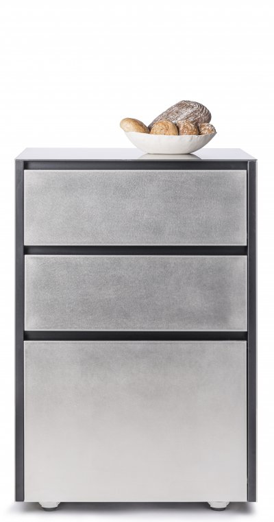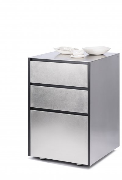 ONO Stauraum Basis Modul - Edelstahl 316. Der Küchenwagen aus mattem Edelstahl der Serie ONO mit zwei kleinen und einer großen Schublade. Die Arbeitsplatte aus 4 mm Voll-Edelstahl ist robust und widerstandsfähig. Die Schubladen sind grifflos und können zur Reinigung einfach ausgeklinkt werden. Schwarzes Innenleben. Das Modul steht auf versteckten Rollen (mit Feststellfuß und Höhenjustierung).