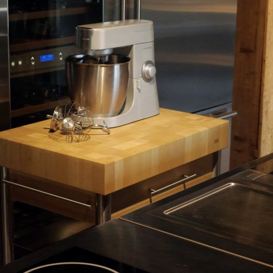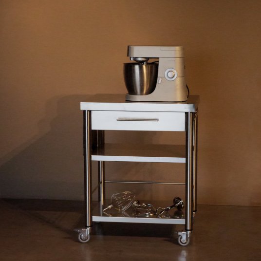 A fully-equipped JOKODOMUS cart that can follow you around the kitchen, making sure you always have it when you need it. A workstation that is perfect for complementary items like slicers or stand mixers. Thanks to its innate elegance and functionality, the cart can serve as the base for all slicing and cutting work in a kitchen. It can also become a kitchen center from which you can serve an aperitif, or the means for bringing a warm dish to a table filled with guests.