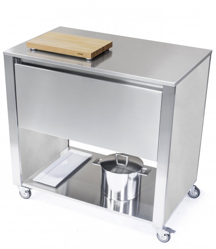Cooking station stainless steel of the series CUN with one big drawer and one shelf underneath. The stainless steel worktop is very sturdy and resistant. The drawer is handleless and can be easily detached for cleansing. The cart has a easy fit system for quick fitting of accessories or a connection board on the left and on the right.