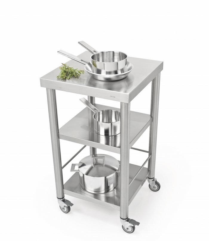 Stainless steel kitchen cart with two shelves underneath and no drawer. The working top of stainless steel is very robust and resistant. A cart without a drawer is optimized for maximum storage. Ideal for your outdoor environment as work station/ trolley alongside your grill. This kitchencart is suitable for the interior and outdoor use.