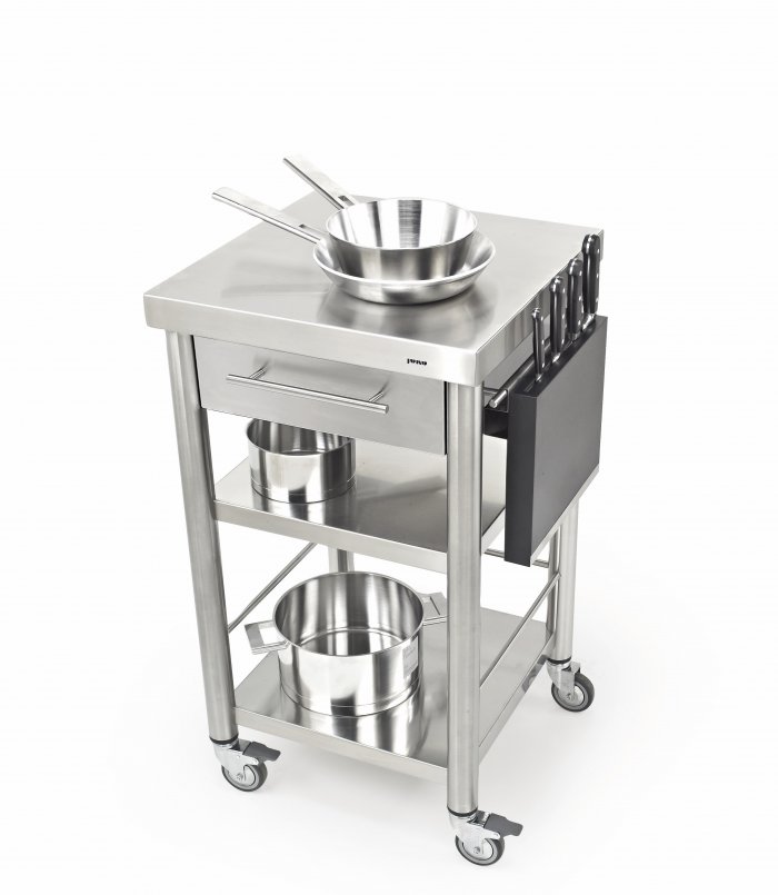Stainless steel kitchen cart of the series Auxilium with two shelves underneath and one drawer. The stainless steel worktop is very sturdy and resistant. The drawer is made of stainless steel and can be easily detached for cleansing. The cart has one side rail on the left and one on the right for quick fitting of accessories or a kitchen cloth. This kitchencart is suitable for the interior and outdoor use.