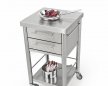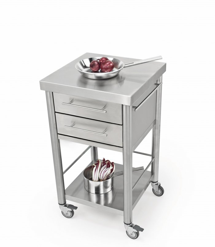 Stainless steel kitchen cart of the series Auxilium with two drawers and one shelf underneath. The stainless steel worktop is very sturdy and resistant. The drawers are made of stainless steel and can be easily detached for cleansing. The cart has one side rail on the left and one on the right for quick fitting of accessories or a kitchen cloth. This kitchencart is suitable for the interior and outdoor use.