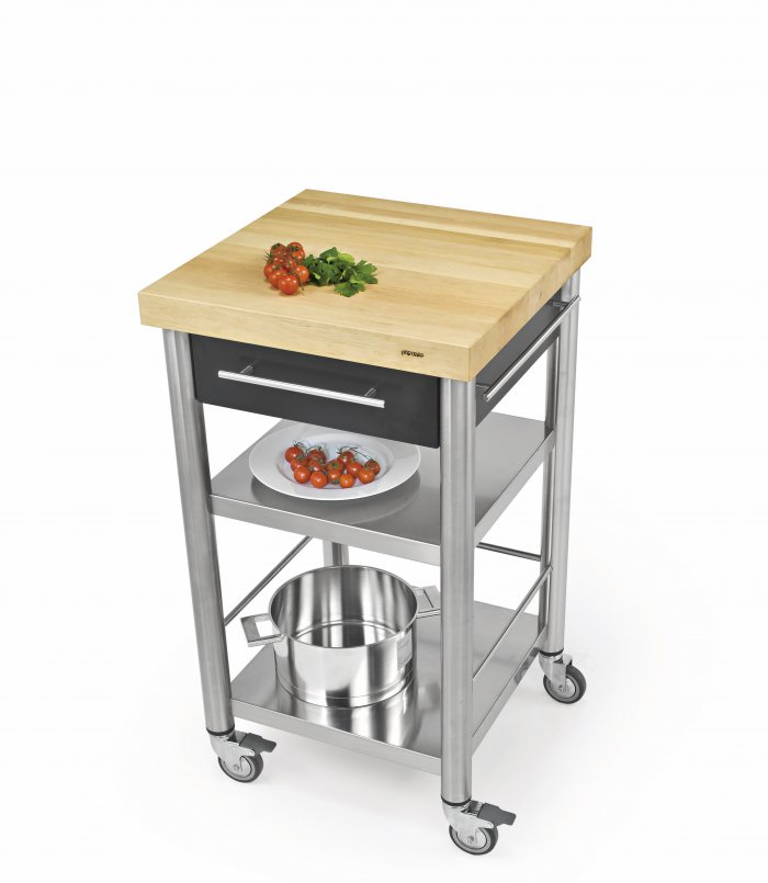 Acrylic stone black kitchen cart with work top of long grain hornbeam of the series Auxilium with two shelves underneath and one drawer. The hornbeam worktop is very sturdy and resistant. The drawer is made of stainless steel and can be easily detached for cleansing. The cart has one side rail on the left and one on the right for quick fitting of accessories or a kitchen cloth.