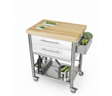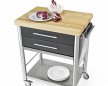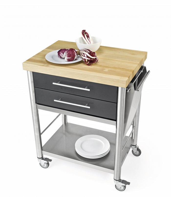 Acrylic stone black kitchen cart of the series Auxilium with two drawers and one shelf underneath. The hornbeam long grain worktop is very sturdy and resistant. The drawers are made of stainless steel and can be easily detached for cleansing. The cart has one side rail on the left and one on the right for quick fitting of accessories or a kitchen cloth.