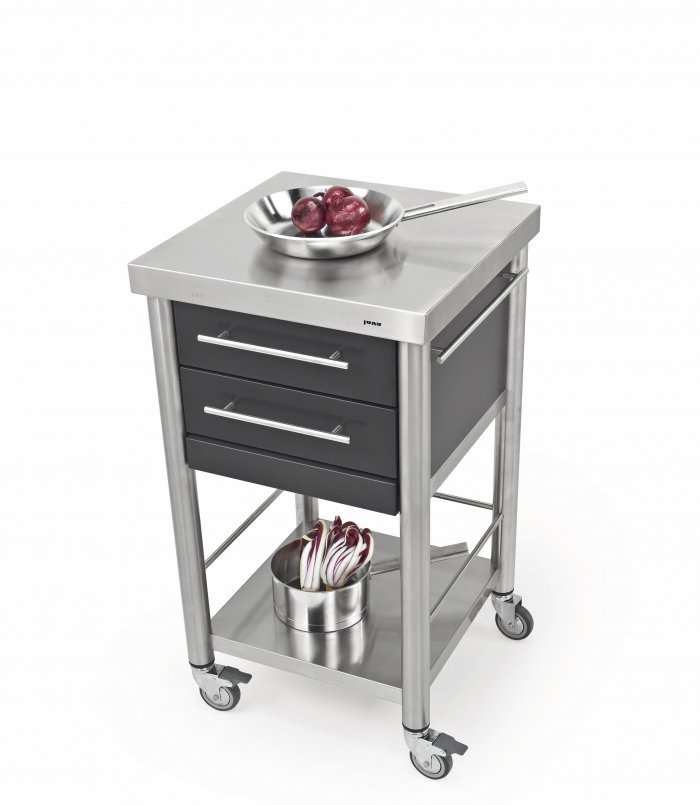 Acrylic stone black kitchen cart of the series Auxilium with two drawers, one pull out cutting board and one shelf underneath. The stainless steel worktop is very sturdy and resistant. The drawers are made of stainless steel and can be easily detached for cleansing. The cutting board of black polyethylene (or of hornbeam) is placed under the second drawer and can be placed on the worktop. It is been hold in place by a stop bar. The cart has one side rail on the left and one on the right for quick fitting of accessories or a kitchen cloth. This kitchencart is suitable for the interior and outdoor use.