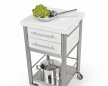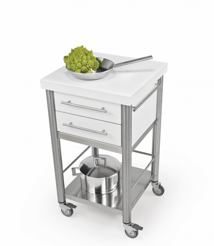 Acrylic stone white kitchen cart of the series Auxilium with two drawers and one shelf underneath. The acrylic stone worktop is very sturdy and resistant. The drawers are made of stainless steel and can be easily detached for cleansing. The cart has one side rail on the left and one on the right for quick fitting of accessories or a kitchen cloth. This kitchencart is suitable for the interior and outdoor use.