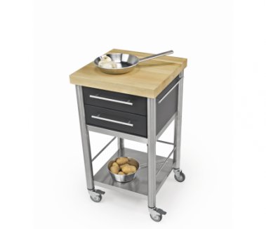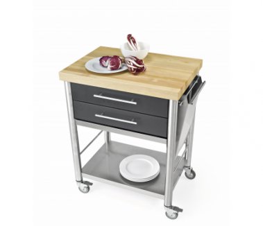 Acrylic stone white kitchen cart of the series Auxilium with two shelves underneath and one drawer. The acrylic stone white worktop is very sturdy and resistant. The drawer is made of stainless steel and can be easily detached for cleansing. The cart has one side rail on the left and one on the right for quick fitting of accessories or a kitchen cloth. This kitchencart is suitable for the interior and outdoor use.