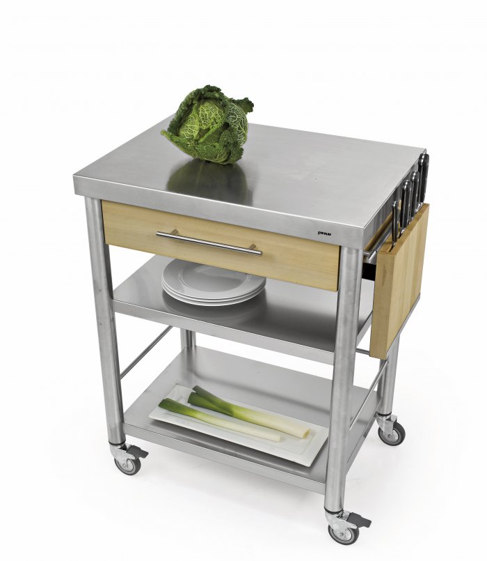 Stainless steel kitchen cart of the series Auxilium with two shelves underneath and one drawer. The stainless steel worktop is very sturdy and resistant. The drawer is made of stainless steel and can be easily detached for cleansing. The cart has one side rail on the left and one on the right for quick fitting of accessories or a kitchen cloth.