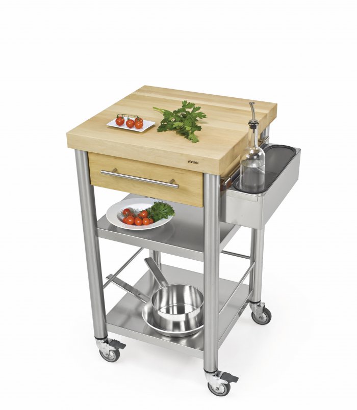 Long grain hornbeam kitchen cart of the series Auxilium with two shelves underneath and one drawer. The long grain hornbeam worktop is very sturdy and resistant. The drawer is made of stainless steel and can be easily detached for cleansing. The cart has one side rail on the left and one on the right for quick fitting of accessories or a kitchen cloth.
