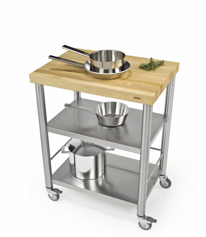 Stainless steel kitchen cart with two shelves underneath and no drawer. The working top of long grain hornbeam is very robust and resistant. A cart without a drawer is optimized for maximum storage.