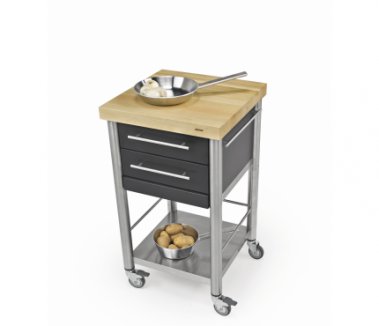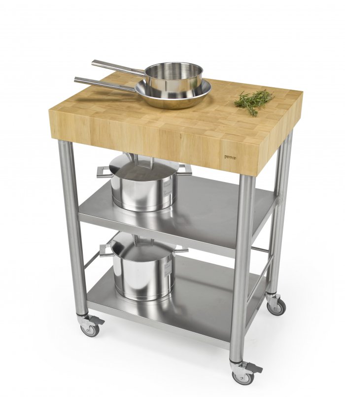 Stainless steel kitchen cart with two shelves underneath and no drawer. The working top of end grain hornbeam is very robust and resistant. A cart without a drawer is optimized for maximum storage.