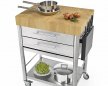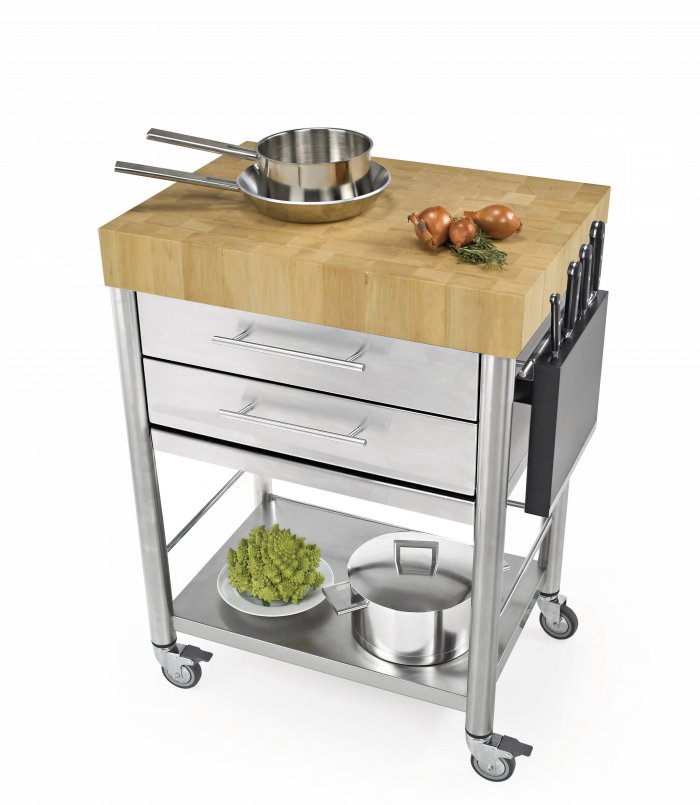 Hornbeam kitchen cart of the series Auxilium with two drawers and one shelf underneath. The end grain hornbeam worktop is very sturdy and resistant. The drawers are made of stainless steel and can be easily detached for cleansing. The cart has one side rail on the left and one on the right for quick fitting of accessories or a kitchen cloth.