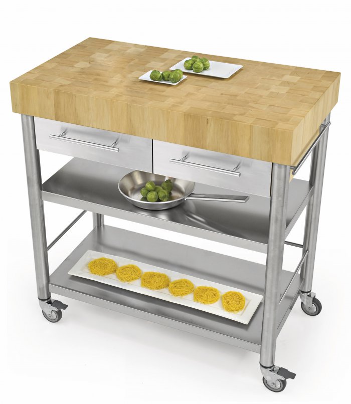 Kitchen cart made of hornbeam end grain of the series Auxilium with two drawers and two shelves underneath. The working top of end grain hornbeam is very robust and resistant. The drawers are made of stainless steel and can be easily detached for cleansing. The cart has one side rail on the left and one on the right for quick fitting of accessories or a kitchen cloth.