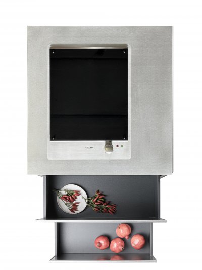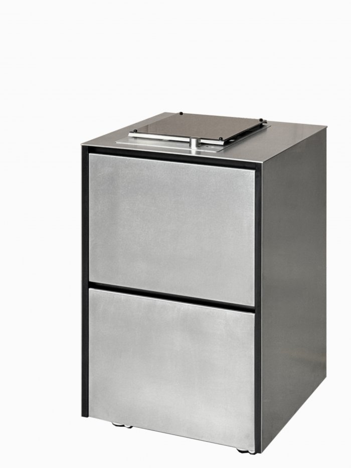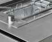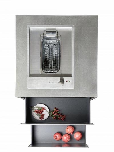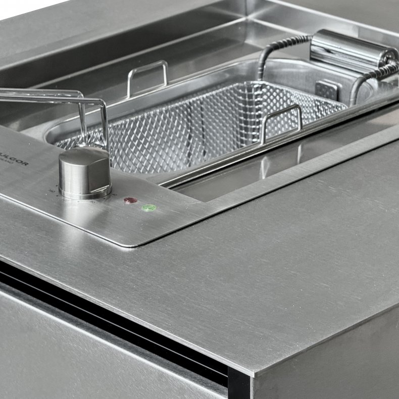 ONO deep fryer - stainless steel 316. Kitchen cart in matte stainless steel of the series ONO with electrical deep fryer and two drawers. The full solid 4 mm stainless steel worktop is very sturdy and resistant. The drawers are handleless and can be easily detached for cleansing. Interiors all black. On hidden wheels (with brake and height adjustment sets). The connection cable is placed under the bottom of the module. The deep fryer has a capacity of 2.7 liters and can be regulated from 40-200 degrees Celsius. It includes: black glass lid (tempered glass) and deep fryer basket made of stainless steel. Tip: use this device alternatively to boil water; quick and easy.