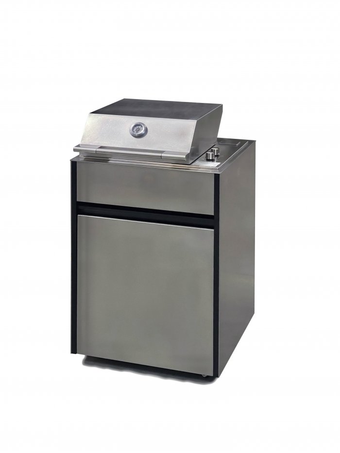 ONO grill module with gas grill with 2 burners 1 door. ONO grill module - stainless steel 316. Kitchen module in matte stainless steel AISI 316 (marine grade) of the series ONO with 1 door (gas cylinder compartment). Gas grill with 2 burners totaling 7,6 kW power (2x 3,8 kW). Heat plate and heat spreader of stainless steel. Grease drawer in stainless steel. 2x open griddle of stainless steel. Gas cylinder drawer maximum height 545mm; gas cylinder max 6kg h465mm. Ignition system: Piezo. With double layered insulated stainless steel lid with thermometer. This appliance will be delivered WITHOUT pressure regulator and WITHOUT gas hose. This appliance is mounting G30-30mbar (LPG) (G20-20mbar nozzles (natural gas/methane) and G30-50mbar nozzles LPG are included). Check BEFORE use if adjustments are needed! Please assure a professional installation. Interiors all black. On hidden wheels (with brake and height adjustment sets).