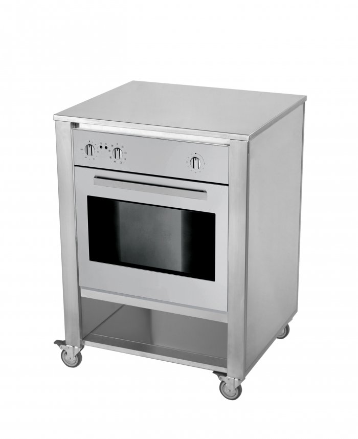 CUN cooking station in stainless steel with oven with 10 programs. The cart has a easy fit system for quick fitting of accessories or a connection board on the left and on the right.