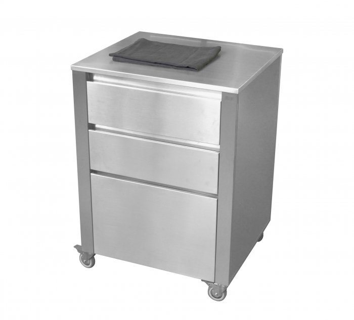 CUN en inox ____ Chariot de cuisine en acier inoxydable de gamme CUN avec deux petit tiroirs et un tiroir grand. Le plan de travail en acier inoxydable est robuste et résistant. Les tiroirs sont sans poignée et pouvons être extrairés pour nettoyage. Le chariot a un système à droite et à gauche pour accrocher des accessoires ou un pont de liaison.