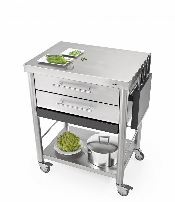 Chariot de cuisine en acier inoxydable de gamme Auxilium avec deux tiroirs, une planche à découper et un plateau inférieur. Le plan de travail en acier inoxydable est robuste et résistant. Les tiroirs sont en acier inoxydable et pouvons être extrairés pour nettoyage. La planche à découper en polyéthylène noir (ou en charmille au choix) est positioné au-dessous de second tiroir. On peut la mettre sur le plan de travail et fixe avec liston d’arrêt. Il-y-a une barre à droite et à gauche pour positioner les accessoires ou pour appendre tissus. Le chariot est propre pour l’intérieur et l’extérieur.