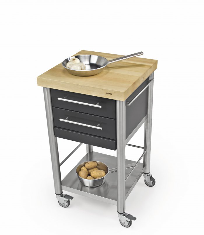 Chariot de cuisine en pierre acrylique noire de gamme Auxilium avec deux tiroirs, une planche à découper et un plateau inférieur. Le plan de travail en charmille coupé en long est robuste et résistant. Les tiroirs sont en acier inoxydable et pouvons être extrairés pour nettoyage. La planche à découper en polyéthylène noir (ou en charmille au choix) est positioné au-dessous de second tiroir. On peut la mettre sur le plan de travail et fixe avec liston d’arrêt. Il-y-a une barre à droite et à gauche pour positioner les accessoires ou pour appendre tissus.