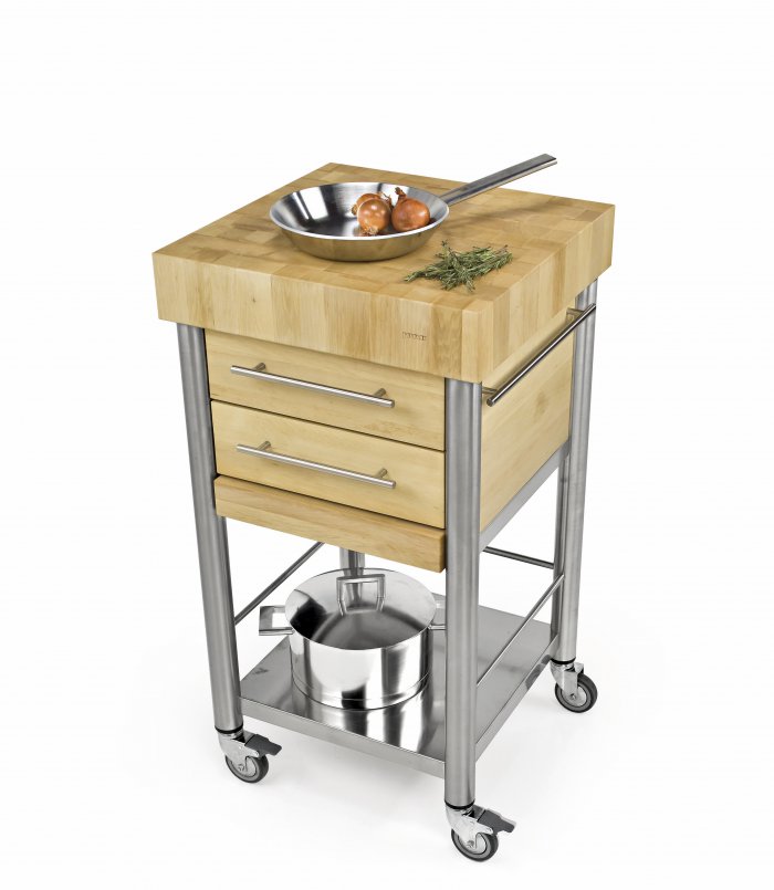 Chariot de cuisine en charmille bois de bout de gamme Auxilium avec deux tiroirs, une planche à découper et un plateau inférieur. Le plan de travail en charmille bois de bout est robuste et résistant. Les tiroirs sont en acier inoxydable et pouvons être extrairés pour nettoyage. La planche à découper en charmille est positioné au-dessous de second tiroir. On peut la mettre sur le plan de travail et fixe avec liston d’arrêt. Il-y-a une barre à droite et à gauche pour positioner les accessoires ou pour appendre tissus.