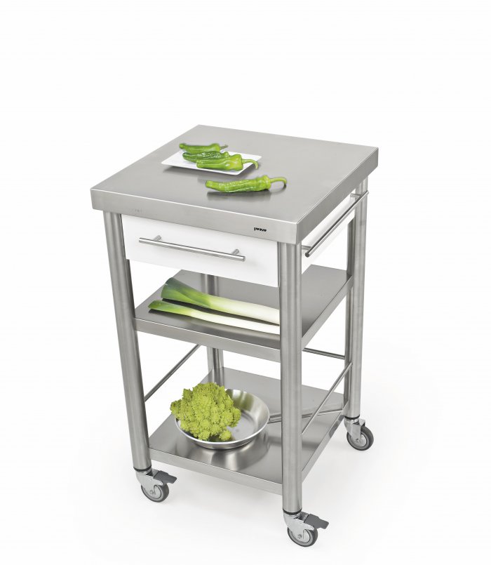 Chariot de cuisine en pierre acrylique blanche et plan de travail en acier inoxydable de gamme Auxilium avec deux plateaux inférieurs et un tiroir. Le plan de travail en acier inoxydable est robuste et résistant. Le tiroir est en acier inoxydable et peut être extrairé pour nettoyage. Il-y-a une barre à droite et à gauche pour positioner les accessoires ou pour appendre tissus. Le chariot est propre pour l’intérieur et l’extérieur.