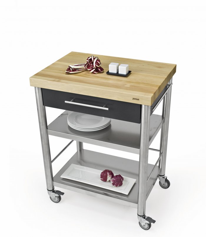Carrello da cucina in pietra acrilica nera e top da lavoro in carpino bianco listellare della serie Auxilium con due ripiani inferiori e un cassetto. Il piano da lavoro in carpino bianco è robusto e resistente. Il cassetto è realizzato in acciaio inox e può essere facilmente estratto per la pulizia. Il carrello ha un ringhierino sia sul lato sinistro che destro per poter agganciare in modo semplice vari accessori o appendere dei cannovacci.