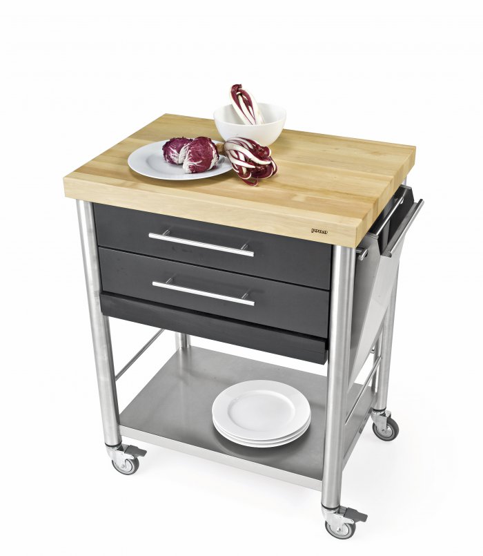 Carrello da cucina in pietra acrilica nera della serie Auxilium con due cassetti, un tagliere aggiuntivo ed un ripiano inferiore. Il piano da lavoro in carpino bianco listellare è robusto e resistente. I cassetti sono realizzati in acciaio inox e possono essere facilmente estratti per la pulizia. Il tagliere aggiuntivo in polietilene nero (o in carpino bianco) è posizionato sotto il secondo cassetto. Per l'utilizzo può essere messo sul piano da lavoro dove viene bloccato da un listello battuta. Il carrello ha un ringhierino sia sul lato sinistro che destro per poter agganciare in modo semplice vari accessori o appendere dei cannovacci.