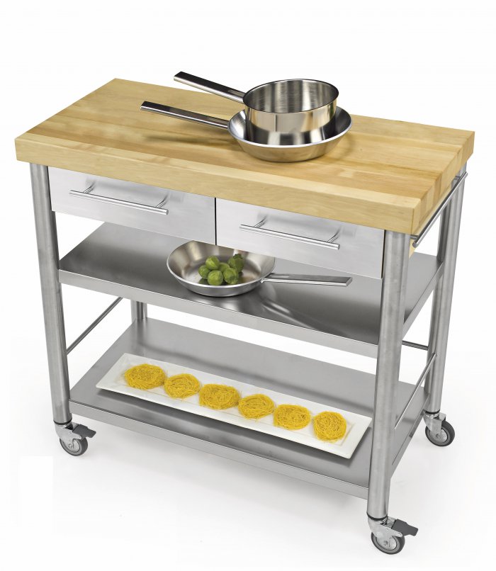 Carrello da cucina in carpino bianco listellare della serie Auxilium con due cassetti e due ripiani inferiori. Il piano da lavoro in carpino bianco listellare è robusto e resistente. I cassetti sono realizzati in acciaio inox e possono essere facilmente estratti per la pulizia. Il carrello ha un ringhierino sia sul lato sinistro che destro per poter agganciare in modo semplice vari accessori o appendere dei cannovacci.