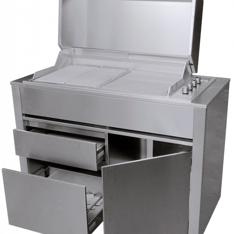 CUN Barbecue con carrello - grill a gas con 4 bruciatori con una potenza complessiva di 15,2 kW (4x3,8 kW). Diffusori di calore e coperture bruciatori in acciaio inox. Cassetto per grassi in acciaio inox. Griglie in acciaio inox: 2x aperte e 1x chiusa. Vano per bombola gas altezza disponibile massima 540mm; bombola gas max 6kg h465mm. Sistema di accensione: piezo. Incluso coperchio a doppio strato isolato in acciaio inox con termometro. Carrello con un cassetto piccolo ed un cassetto grande, nonché vano per bombola gas (con porta). Il carrello ha un sistema di fissaggio sia sul lato sinistro che destro per poter agganciare in modo semplice vari accessori o un ponte di connessione. Questo apparecchio viene consegnato SENZA regolatore di pressione e SENZA tubo del gas. Questo apparecchio é equipaggiato con ugelli G30-30mbar (GPL) (ugelli G20-20mbar (gas naturale/metano) e G30-50mbar GPL sono in dotazione). Controllate PRIMA dell’utilizzo se servono adattamenti/cambiamenti! Vi preghiamo di assicurare un’installazione a regola d’arte.