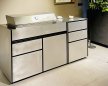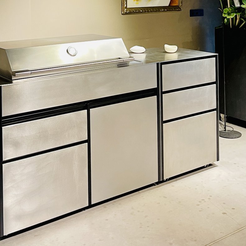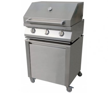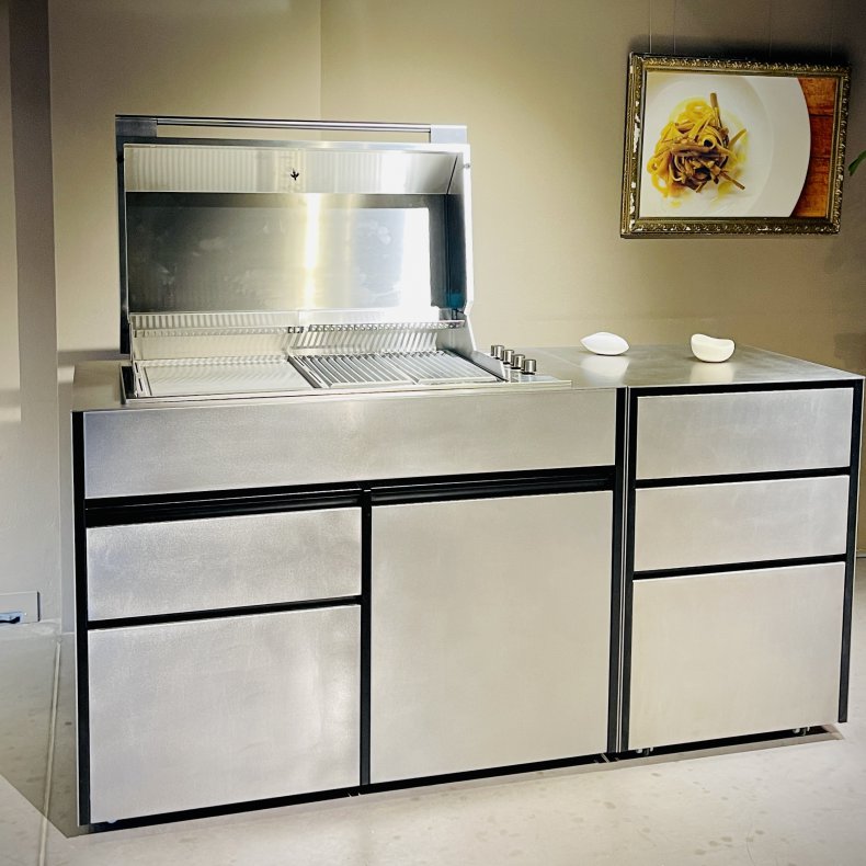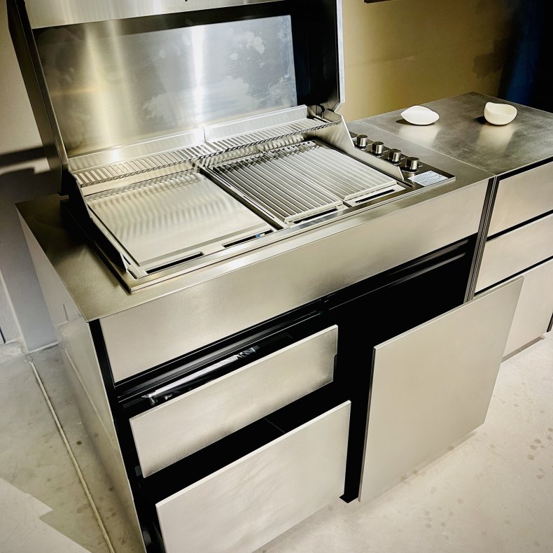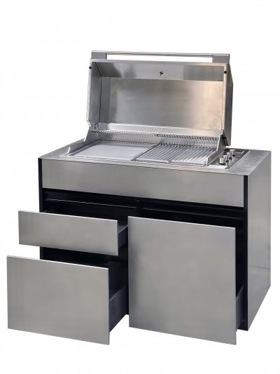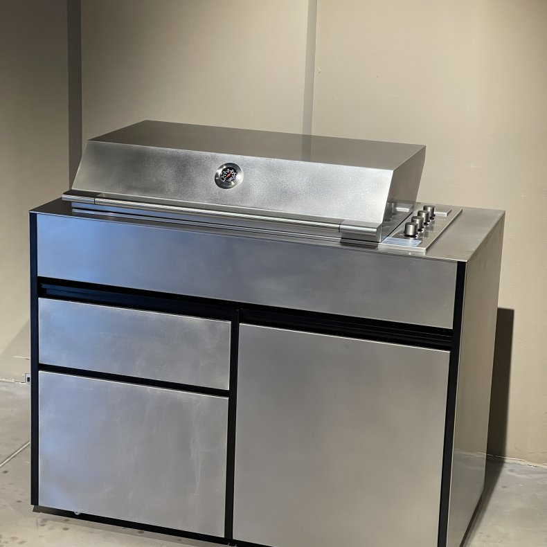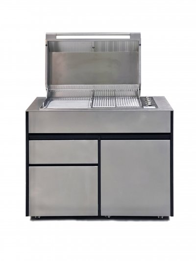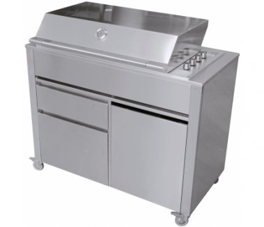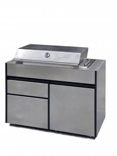 ONO modulo grill 4 bruciatori e 2 cassetti ed 1 porta - acciaio inox 316. Carrello da cucina in acciaio inox opaco della serie ONO con grill e 2 cassetti ed 1 porta (adibito a comparto bombola). Grill a gas con 4 bruciatori con una potenza complessiva di 15,2 kW (4x3,8 kW). Diffusori di calore e coperture bruciatori in acciaio inox. Cassetto per grassi in acciaio inox. Griglie in acciaio inox: 2x aperte e 1x chiusa. Cassetto per bombola gas altezza disponibile massima 545mm; bombola gas max 6kg h465mm. Sistema di accensione: piezo. Incluso coperchio a doppio strato isolato in acciaio inox con termometro. Questo apparecchio viene consegnato SENZA regolatore di pressione e SENZA tubo del gas. Questo apparecchio é equipaggiato con ugelli G30-30mbar (GPL) (ugelli G20-20mbar (gas naturale/metano) e G30-50mbar GPL sono in dotazione). Controllate PRIMA dell’utilizzo se servono adattamenti/cambiamenti! Vi preghiamo di assicurare un’installazione a regola d’arte.. I cassetti sono senza maniglia e possono essere facilmente estratti per la pulizia. Interni completamente neri. Il modulo è su ruote nascoste (con freno e livellamento).