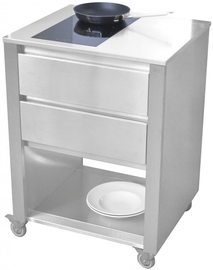 CUN induzione acciaio inox ___ Carrello da cucina in acciaio inox della serie CUN con piano di cottura ad induzione 2 zone. Con due cassettini ed un ripiano. I cassetti sono senza maniglia e possono essere facilmente estratti per la pulizia. Il carrello ha un sistema di fissaggio sia sul lato sinistro che destro per poter agganciare in modo semplice vari accessori o un ponte di connessione.