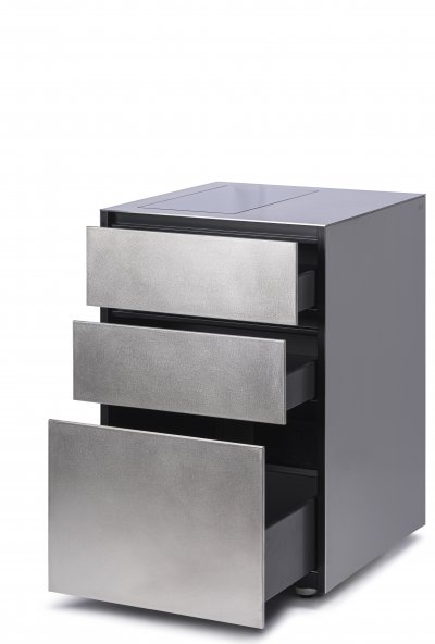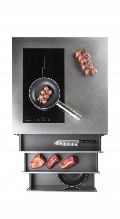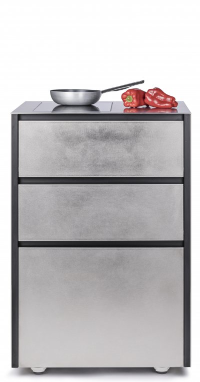 ONO induzione 2 zone - acciaio inox 316. Carrello da cucina in acciaio inox opaco della serie ONO con piano di cottura ad induzione 2 zone con due cassetti piccoli e un cassetto grande. Il piano di lavoro in acciaio inox pieno di 4 mm è robusto e resistente. I cassetti sono senza maniglia e possono essere facilmente estratti per la pulizia. Interni completamente neri. Il modulo è su ruote nascoste (con freno e livellamento). Il cavo di alimentazione si trova sotto il fondo del modulo. Induzione 2 zone • potenza totale 3,7 kW • 1 zona 200mm diametro 2,3-3 kW • 1 zona 160mm 1,4 kW