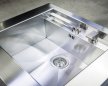 CUN lavello acciaio inox ___ Carrello da cucina in acciaio inox della serie CUN con lavello. Il lavello è saldato direttamente sul piano di lavoro, la rubinetteria è estraibile di tipo telescopico. Questo permette uno stoccaggio o una copertura del carrello ottimale. L'entrata dell'acqua fredda (attacco rapido tipo giardino) e lo scarico (diametro 40mm) si trovano sul fondo del carrello. Il cassetto è senza maniglia e può essere facilmente estratto per la pulizia. Il carrello ha un sistema di fissaggio sia sul lato sinistro che destro per poter agganciare in modo semplice vari accessori o un ponte di connessione. Disponibile come accessorio copertura lavellopiano di lavoro code900140.